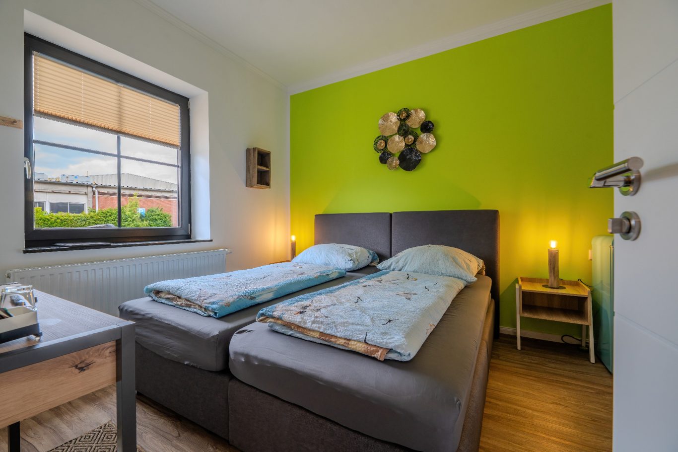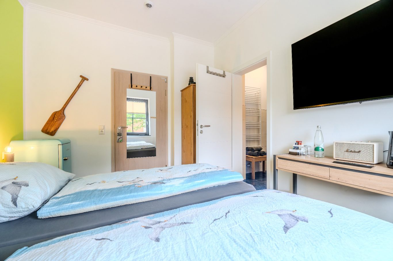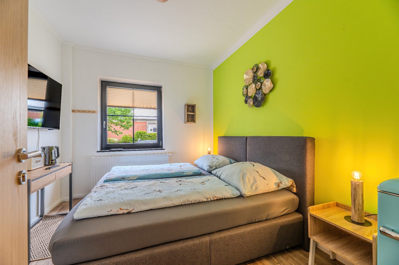 Treten Sie ein in Ihr gemütliches Hotelzimmer oder die Studio-Ferienwohnung und fühlen sich sofort wie zu Hause. Die warmen Farben und die liebevoll ausgewählte Einrichtung schaffen eine behagliche Atmosphäre, in der Sie wunderbar entspannen können. Das komfortable Bett lädt nach einem ereignisreichen Tag zum Träumen ein, während der kleine Tisch Platz bietet, um Erinnerungen festzuhalten oder den nächsten Ausflug zu planen. Genießen Sie die Annehmlichkeiten, die Ihnen geboten werden und lassen den Alltag hinter sich. Willkommen in Ihrem gemütlichen Rückzugsort!