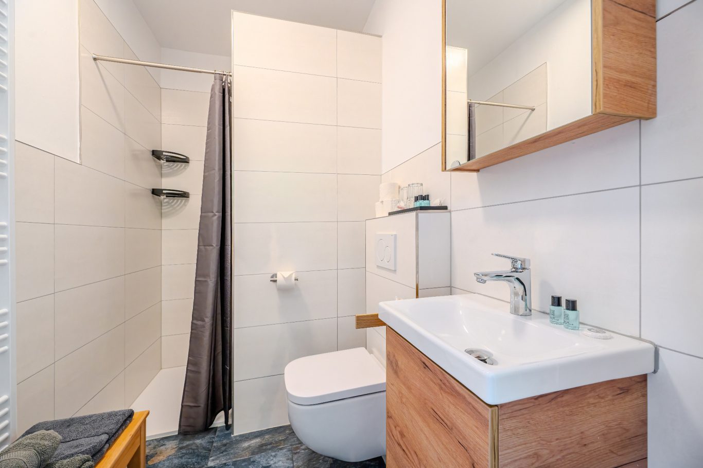 In jedem Zimmer finden Sie ein eigenes Badezimmer, das komfortabel eingerichtet ist, damit Sie sich wie zu Hause fühlen. Unsere Betten sind besonders bequem und laden zu erholsamen Nächten ein. In den Kleiderschränken haben Sie Platz, um Ihre Kleidung und persönlichen Gegenstände ordentlich zu verstauen.